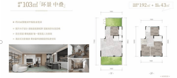 中叠,建面约103㎡,实得使用约192㎡,有露台,面积约43㎡。中叠最主要的是性价比高,上中下里面总价最便宜的。