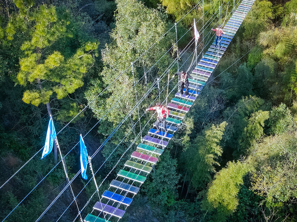 刺激体验与游乐项目方面,步步惊心玻璃桥全长近200米,踏板之间有间隙,走在上面惊险刺激又有惊无险;悬崖秋千让游客佩戴保险设备后被推起荡向山间,感受一飞冲天的刺激,还能换角度欣赏美景;高空滑索全长230多米,落差20多米,从山峰一路滑至谷底,风驰电掣的速度让人直呼过瘾,同时还能在高空欣赏峡谷景色;激速漂流(彩虹水滑道)是极具特色的森林高空水滑漂流,全长420米,垂直高度115米,两人一组乘坐橡皮艇,在水流冲击下沿滑道滑下山谷,体验速度与激情;丛林探险设置了踩木桩、过踏板等各种难易不同的关卡,考验游客的速度、力量和毅力;童趣旱滑旱滑道全长180米,总落差达130米,沿着山脉盘旋而下,速度可自行掌控;旋转秋千能够360度旋转,由慢而快,让游客体验失重的感觉;蒙古射箭可以让游客体验拉弓射箭,感受蒙古人的豪放情怀;网红摇摆桥则适合组队进行比赛,体验从桥上跌落山泉水中的刺激感,还能进行泼水比赛;拓展攀岩作为户外拓展项目,能激发游客的潜能、磨炼意志。